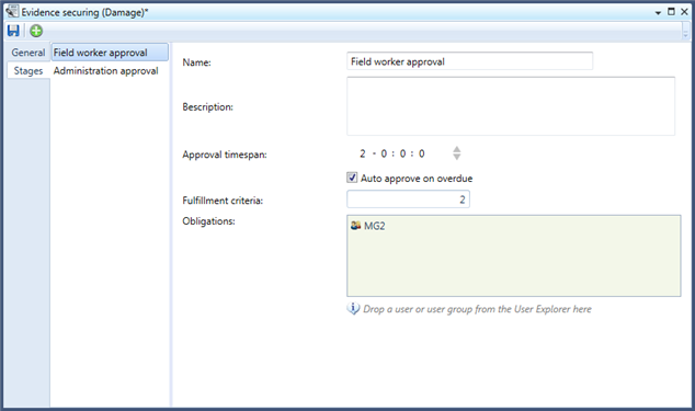 In Obligations (a user and user groups control) you select the users and / or user groups that have the obligation to approve this stage in the process.