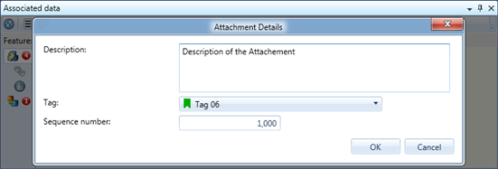 Sequence number, Description and Tag of a single selected attachment can be edited in a separate window modal window, as shown in figure 4. Choose Edit from the attachment's context menu to bring up this window modal window.