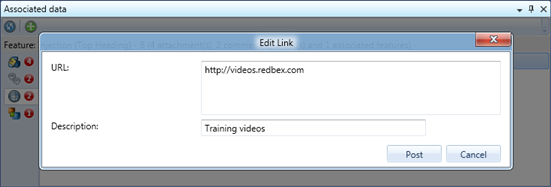 The grid lists all available links with their URL and their description. You can directly follow the linke by clicking the URL. To create a new link select Add from the toolbar. This will open a window modal dialogue that allows you to specify the URL and description of the new link.