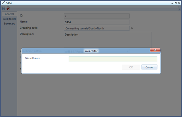Specification of the Coordinate system is mandatory. The setting defines on which coordinate system the axis definition is based, i.e. in which coordinate system the axis points are expressed. Note that changing the axis coordinate system is possible for existing axis but it will give the already defined axis points a different real world position.
