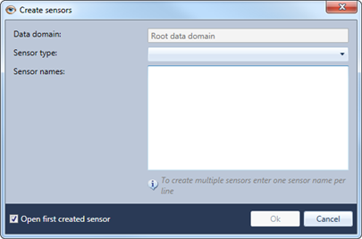 The Create Sensors window is a modal window used to create sensors within a domain. The window can be opened from the context menu of a domain in the Data Domain Explorer.