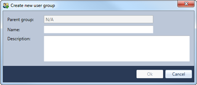 The Create User Group window is a modal window used to create user groups. The window can be opened from the toolbar in the User & User Groups window (for root groups) or from the context menu of a user group in the User & User Groups window (for subordinate groups).