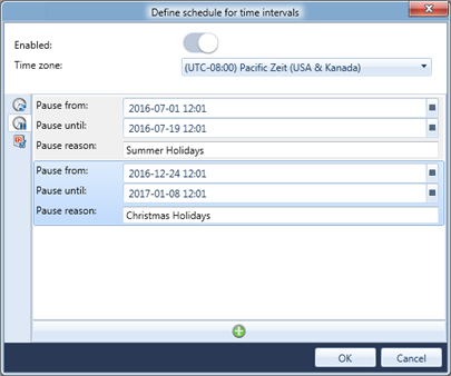On the Recurring events pauses tab you can pauses for recurring events, each pause must have a Start date and an End date and may have a Reason that describes why this event pause was created. To add a pause press the Add button on bottom of the List view. Do delete a pause right click the pause event ans select Delete from the context menu