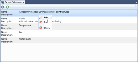 To create a new export definition choose Add in the Window's toolbar. Existing definitions can be opened by double clicking the list element or by opening the context menu and selecting Edit. The context menu also provides the possibility to Delete an existing export definition and to directly Run an export Definition