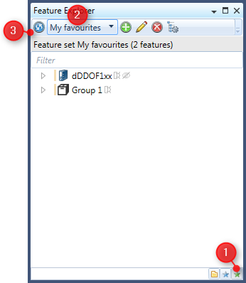 The Feature Sets panel is used to show or modify any of the current user's feature sets. The Drop down list in the Toolbar (figure 1:2) can be used to switch between the Feature-Sets of the current user. The tree view will always show the set members of the Feature-Set selected in the toolbar. Selecting Reload (figure 1:3) from the toolbar will reload information for all features in the currently shown feature set.