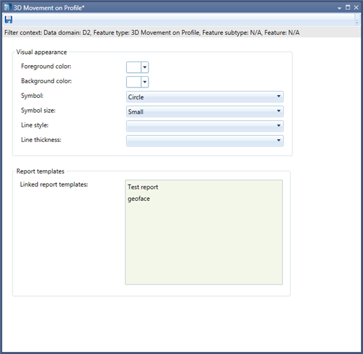 The Report templates area can be used to link existing report templates to features in this context. To assign a report template to all features in the context drag a report template from the Data Domain Explorer to the list. The system will use a match all approach and will union all assigned reports.