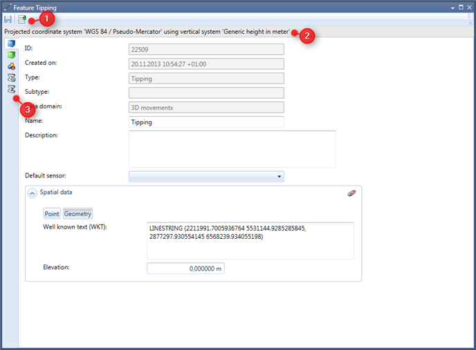 Beneath the toolbar (the info bar displays information about the spatial system used with this feature or its observation (figure 1:2). This information is necessary for the right interpretation of spatial data and other data referring to the spatial system within the feature or the feature's observations