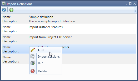 To create a new (stored) import definition click Add in the toolbar. Note that you can also create a new on-the-fly import definition that way by just not storing the new import definition. To edit an already stored import definition select Edit from the context menu.