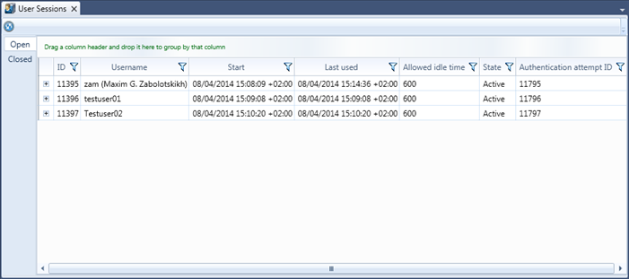 The Open tab on the window shows a grid with all open user sessions. Each grid row displays information about one open user session, in the expansion area of each grid row detailed client information is displayed. The State column displays the status of the open user session.